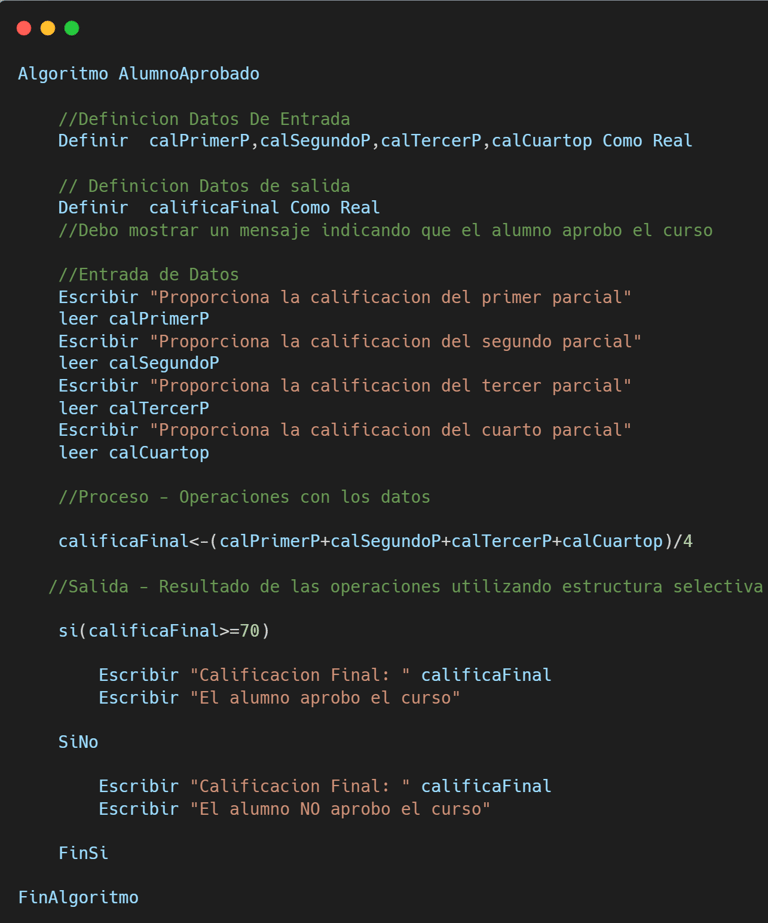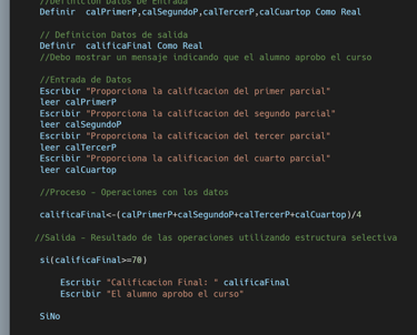 Algoritmo en PSeint que calcula la calificacion final de un semestre despues de leer cuatro calificaciones una por parcial y muestra un mensaje si el alumno aprobo o no dicho curso.